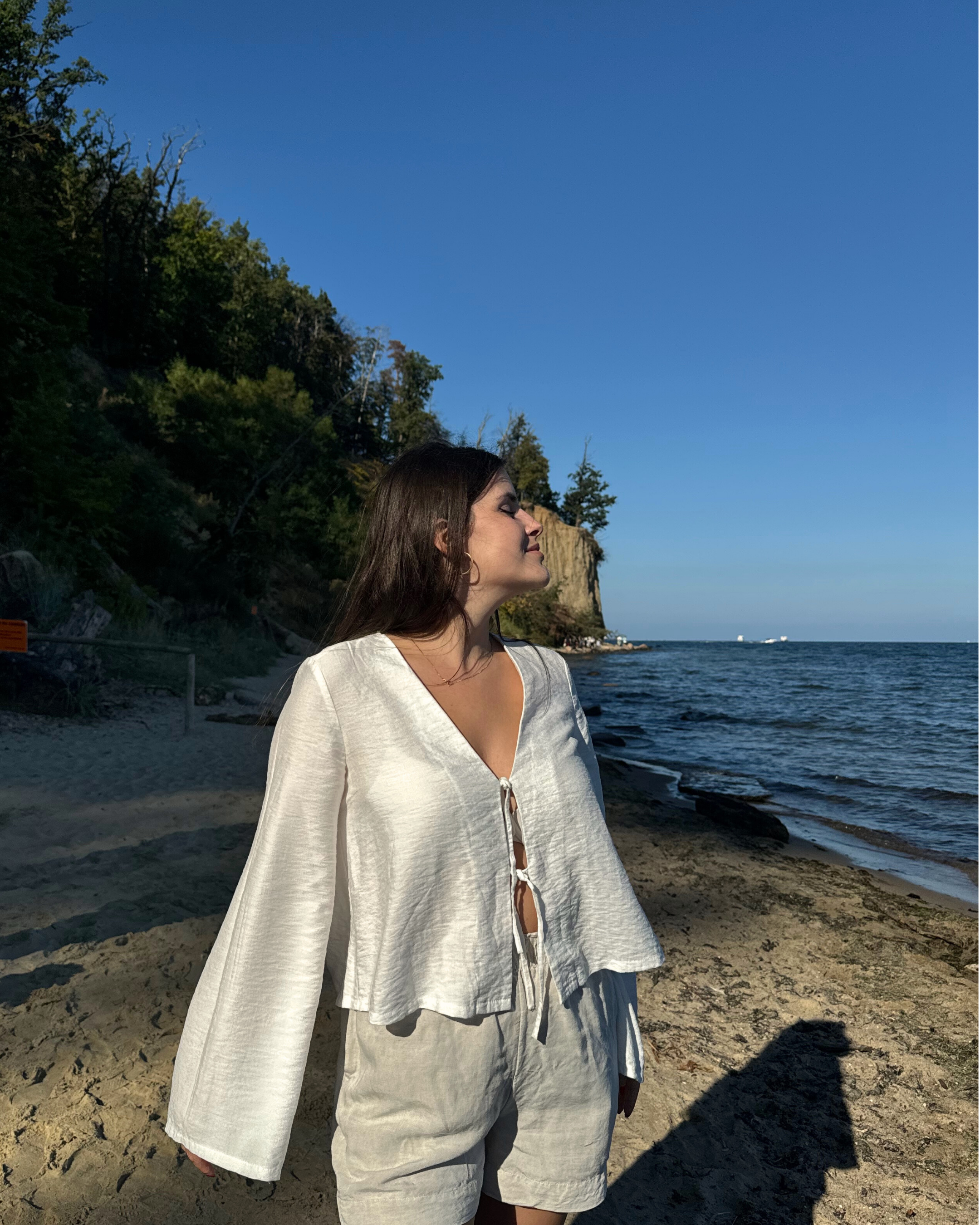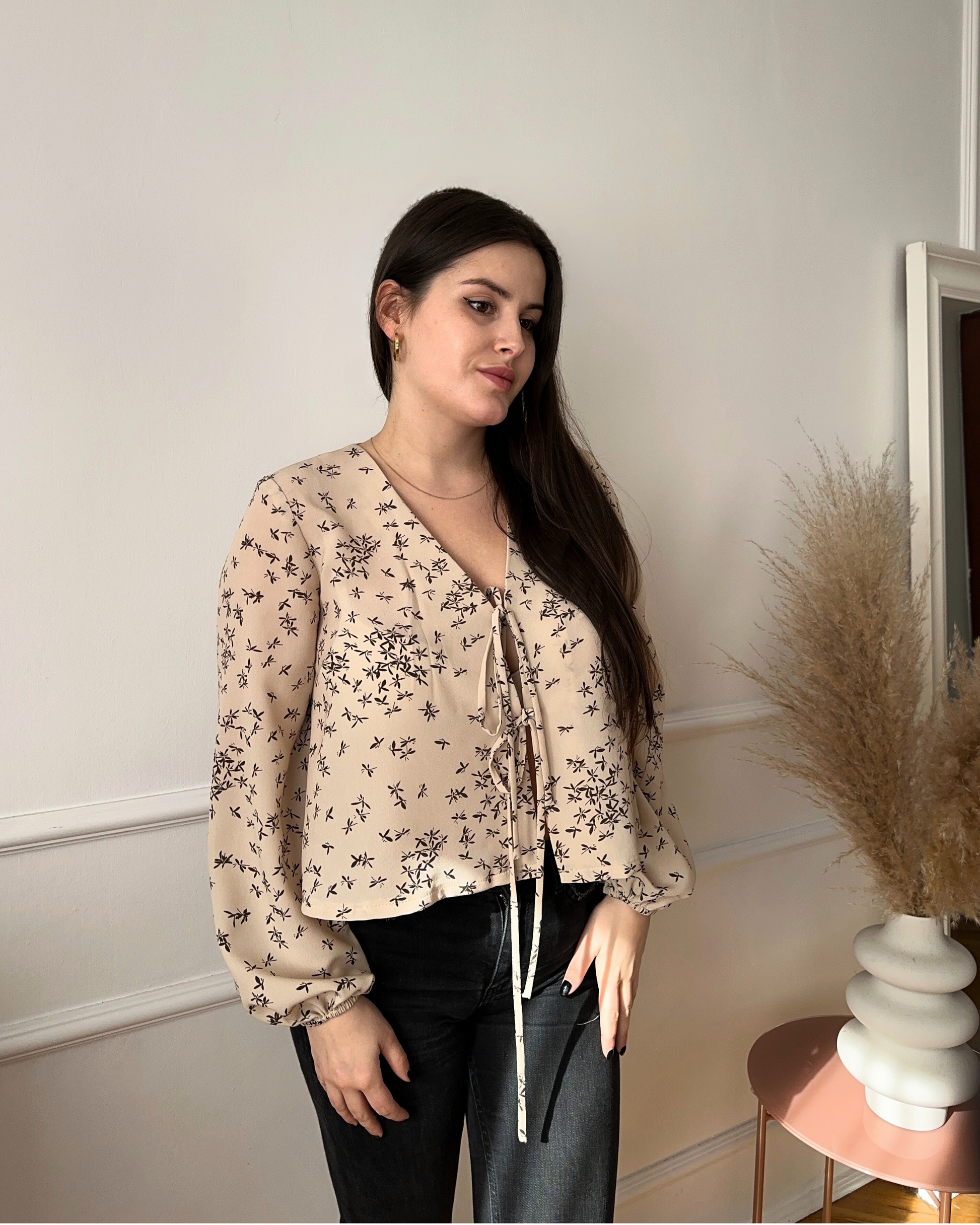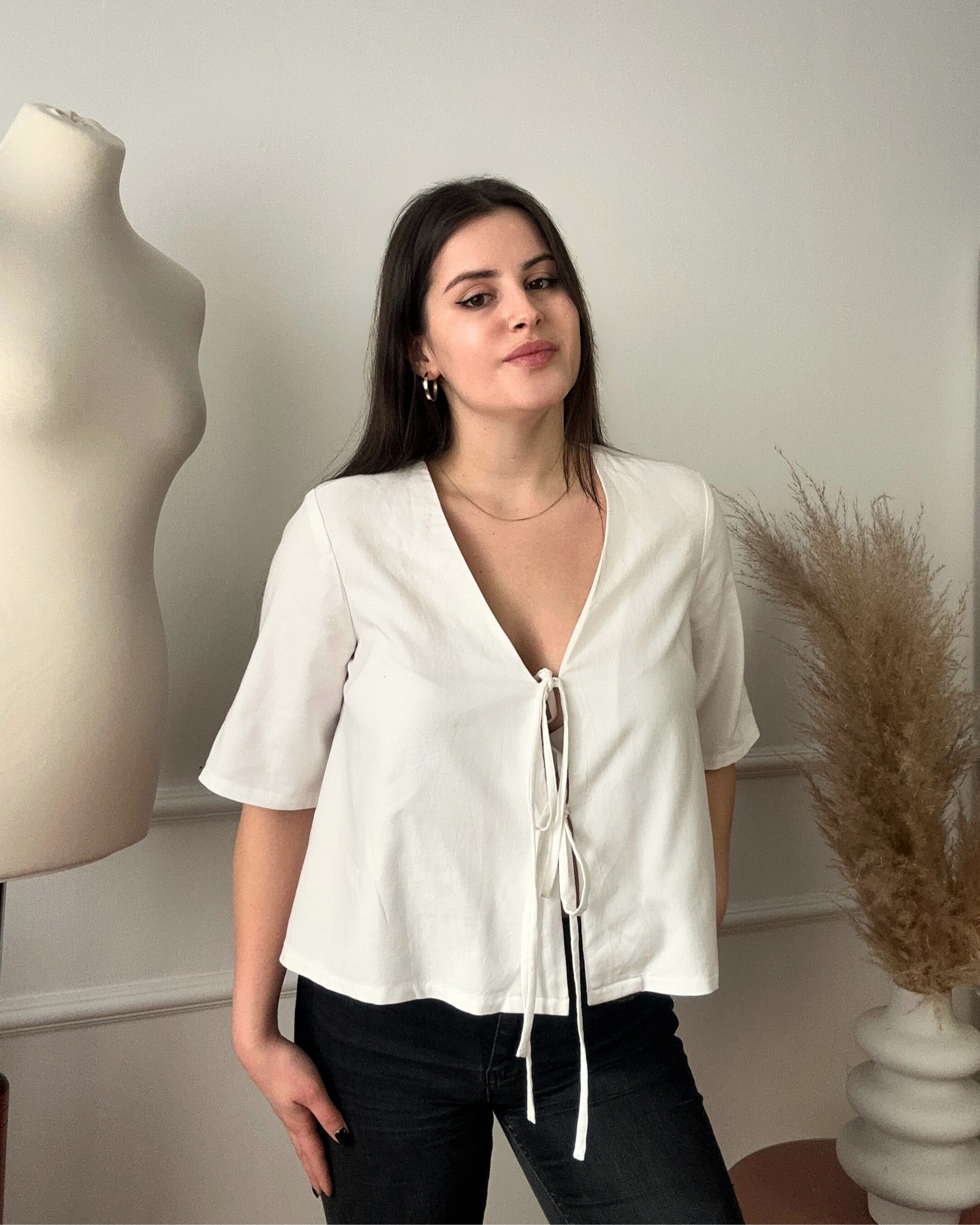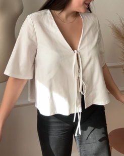 This is the digital PDF sewing pattern for the Adeline Blouse. It features an open tie-up front with double ties for a modern, feminine look that also lets you adjust the fit. The blouse has a curved V-neckline and a relaxed, loose-fit design, making it both stylish and comfortable.