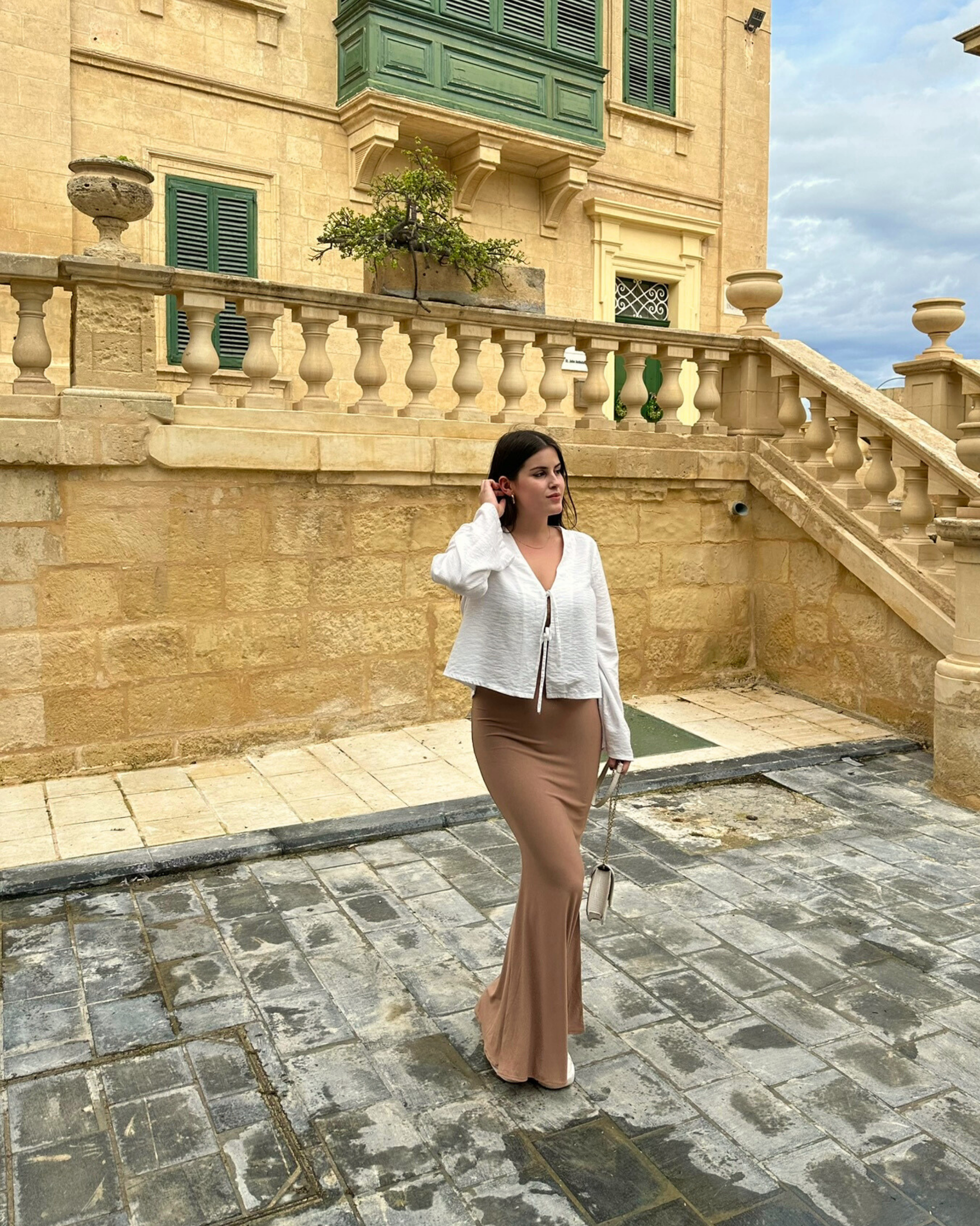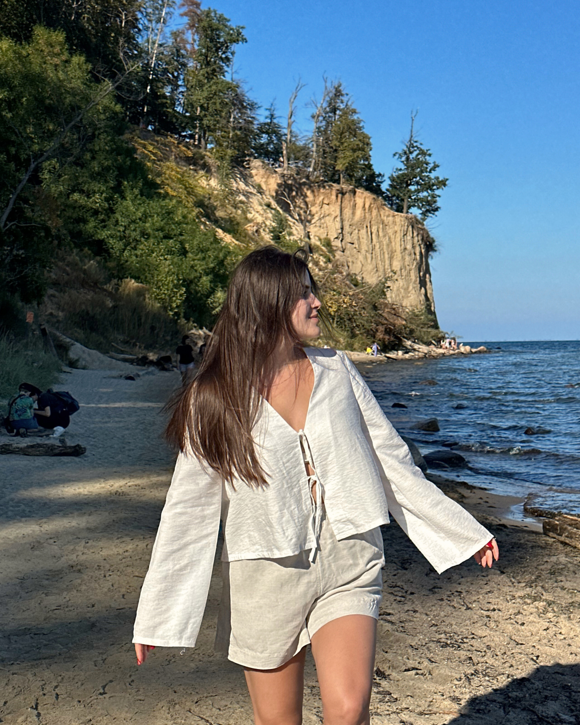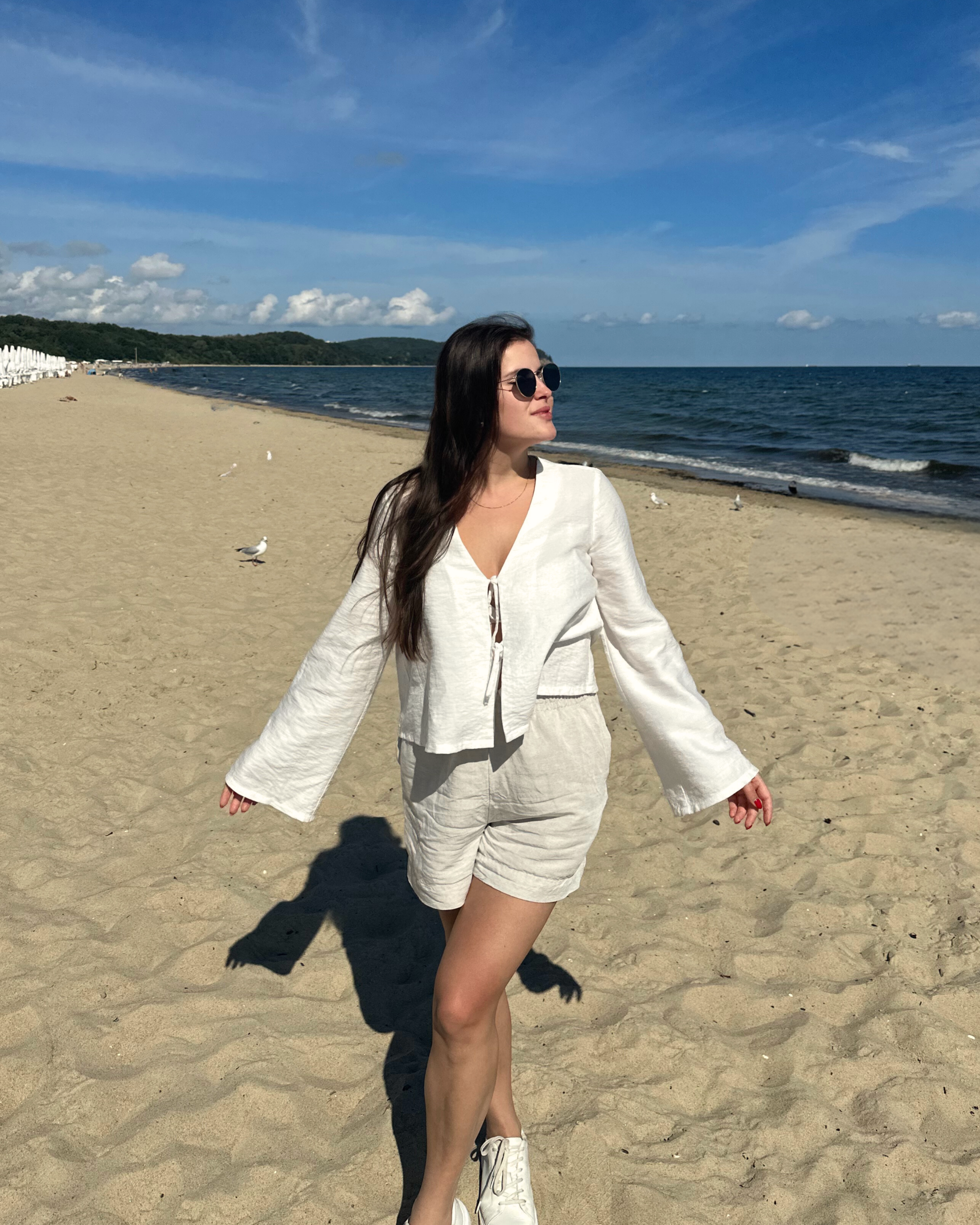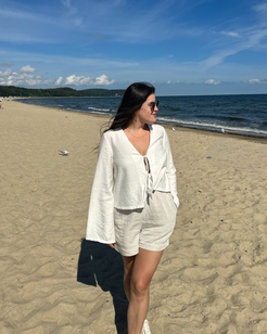 This is the digital PDF sewing pattern for the Adeline Blouse. It features an open tie-up front with double ties for a modern, feminine look that also lets you adjust the fit. The blouse has a curved V-neckline and a relaxed, loose-fit design, making it both stylish and comfortable.