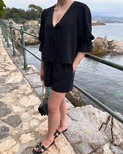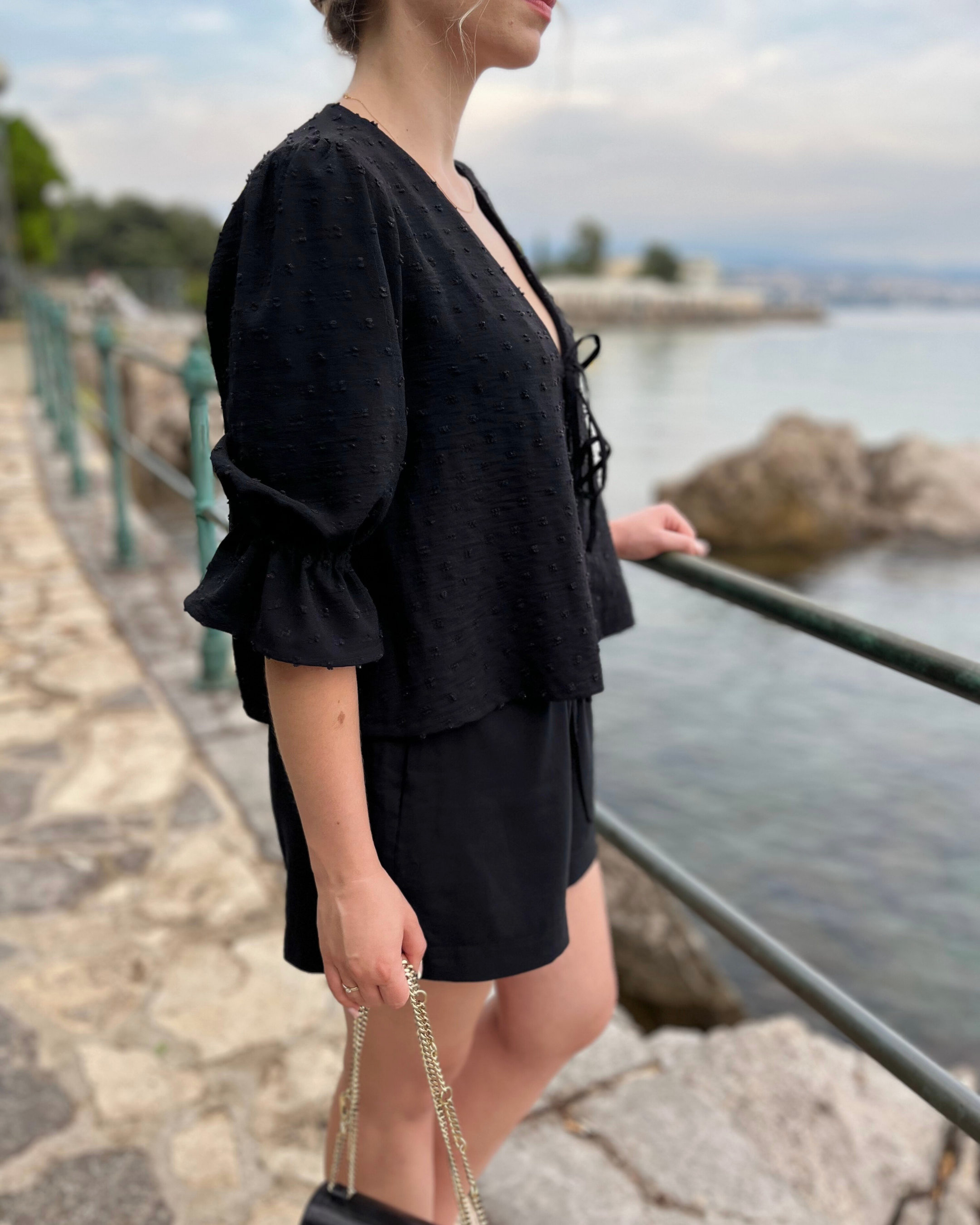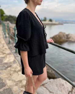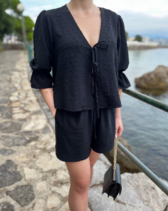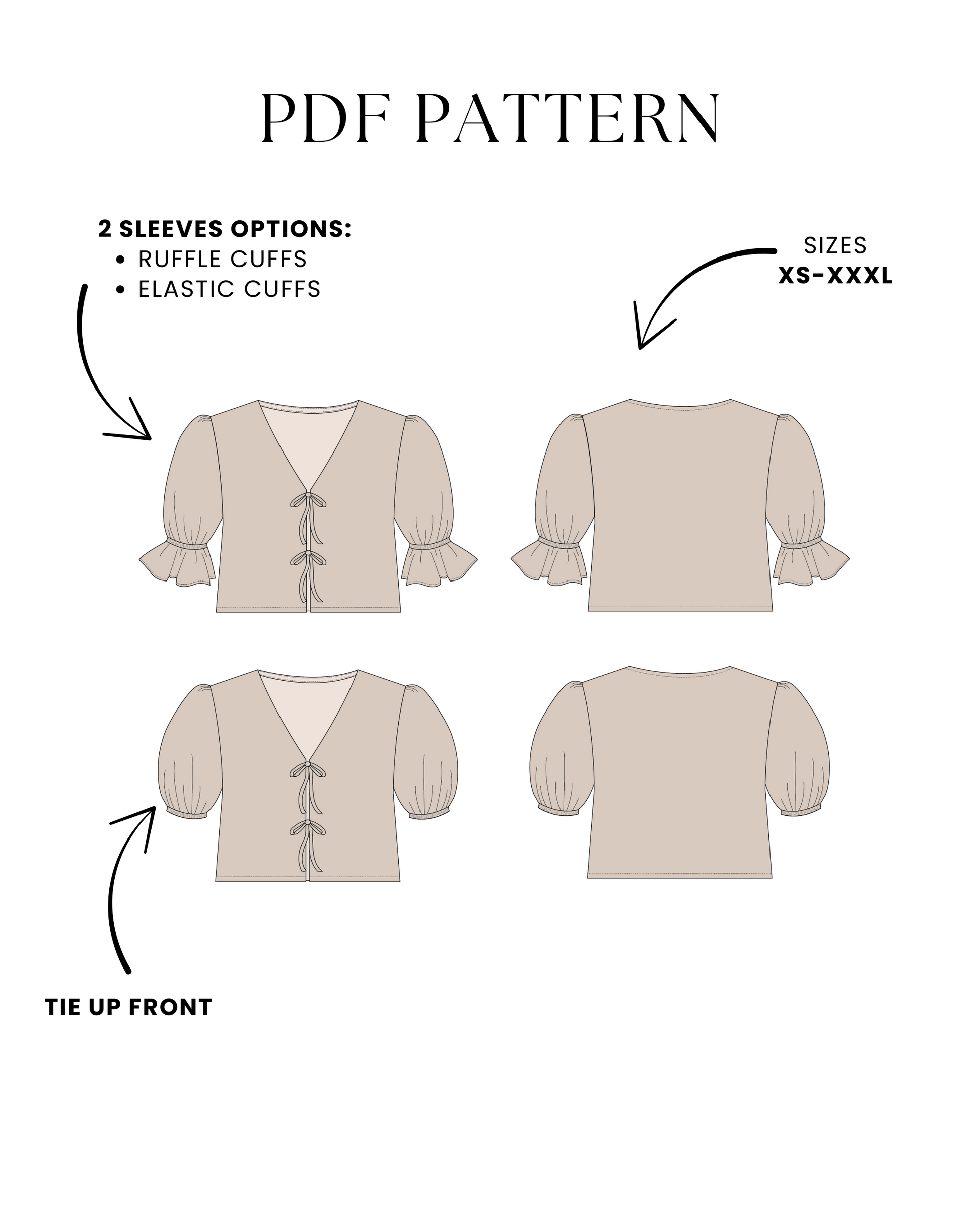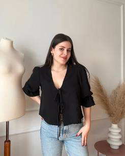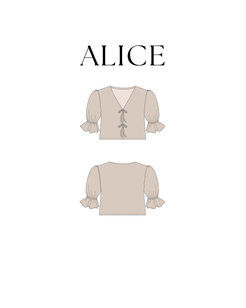 This is the digital PDF sewing pattern for the Alice Blouse. It features an open tie-up front with double ties for a modern, feminine look while allowing you to adjust the fit. The blouse has a curved V-neckline and a relaxed, loose-fit design.