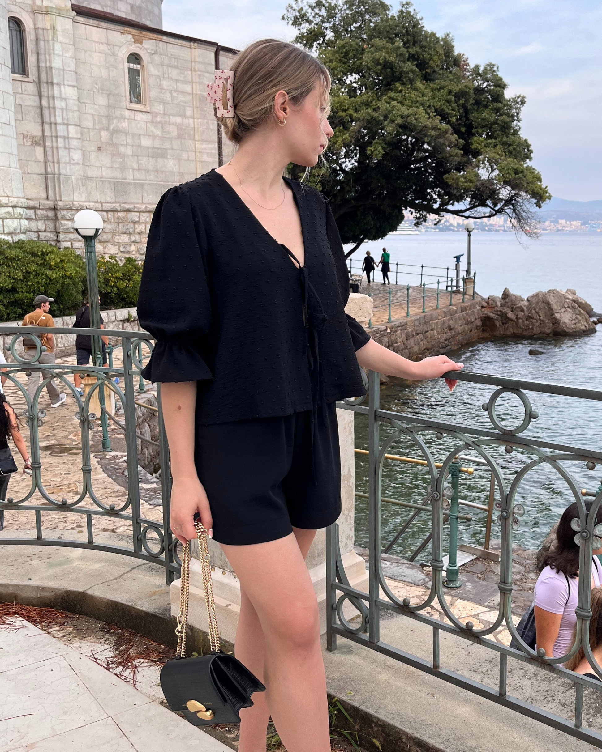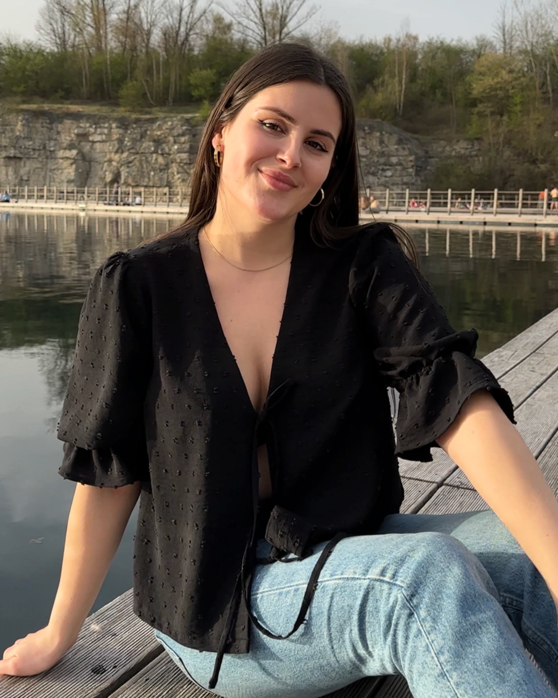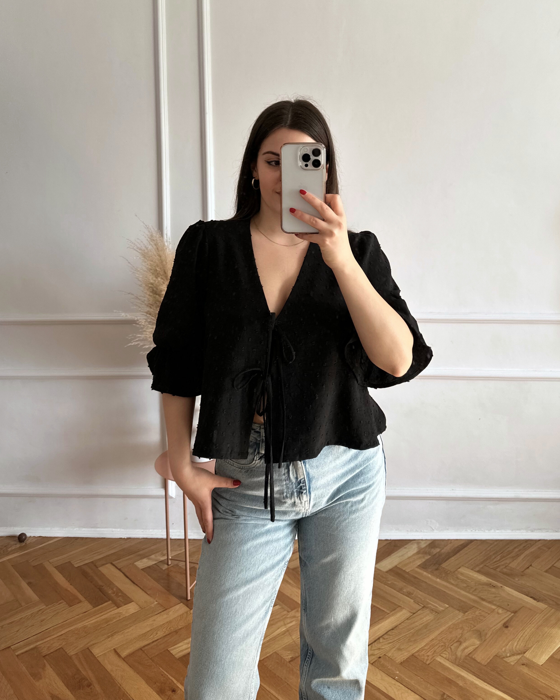 This is the digital PDF sewing pattern for the Alice Blouse. It features an open tie-up front with double ties for a modern, feminine look while allowing you to adjust the fit. The blouse has a curved V-neckline and a relaxed, loose-fit design.