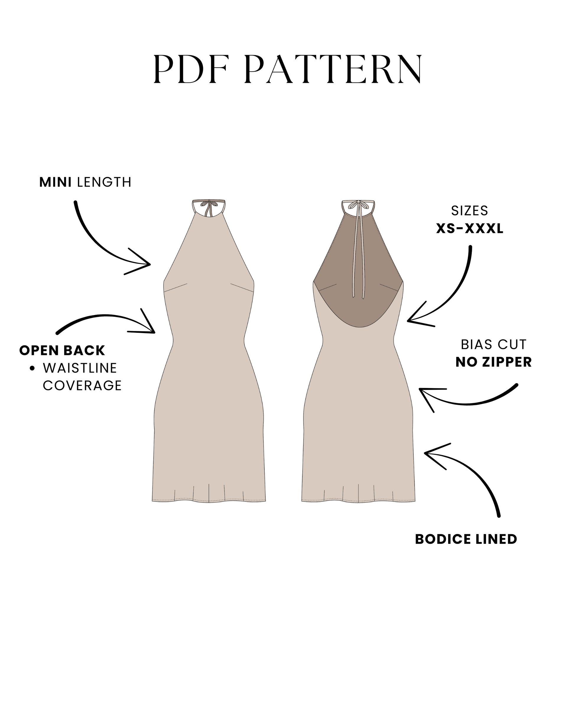This is the digital PDF sewing pattern for the Andrea Dress. A stylish and comfortable design, it features charming spaghetti strap ties at the neck and an open back. The halterneck highlights your shoulders and back. The bodice is fully lined for added comfort and a polished finish. The dress is designed as a slip-on style, eliminating the need for a zipper.