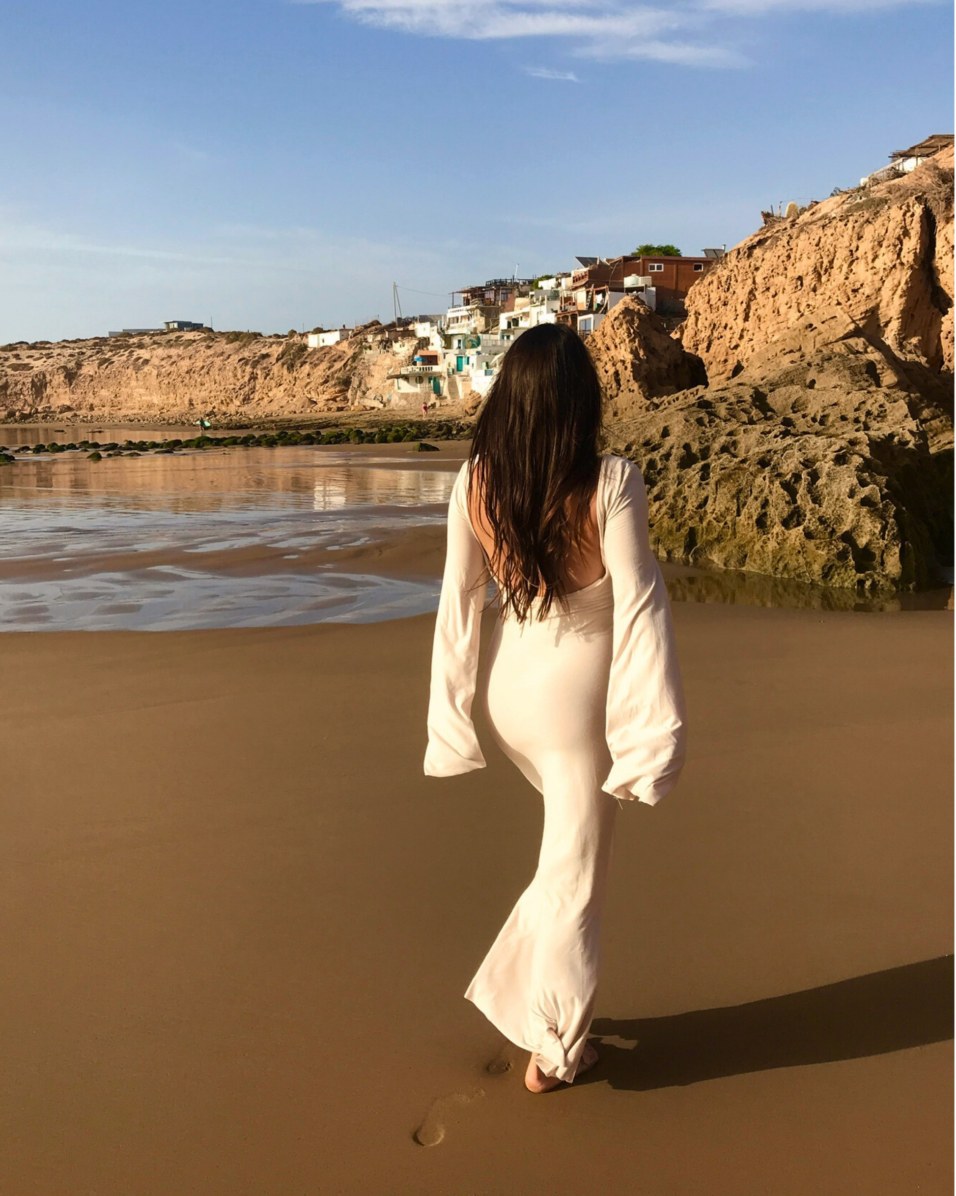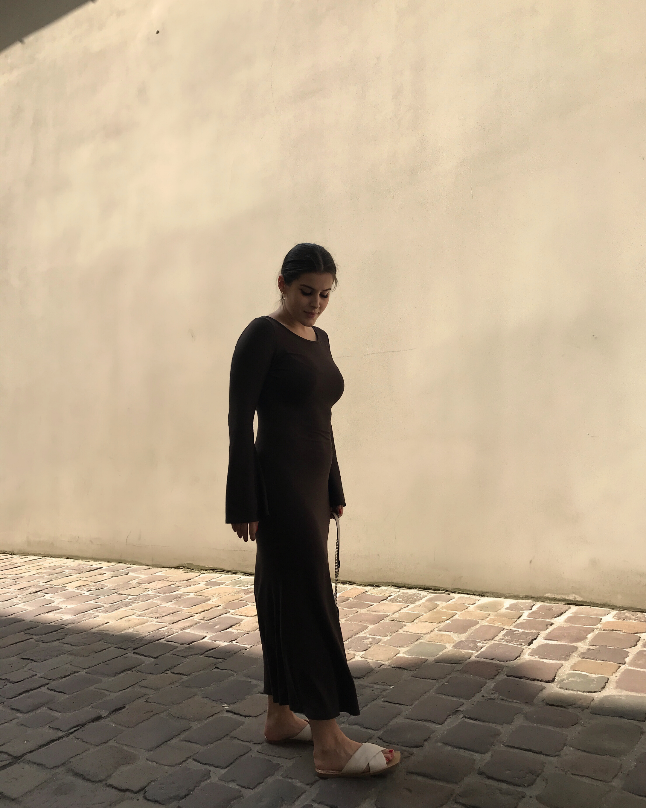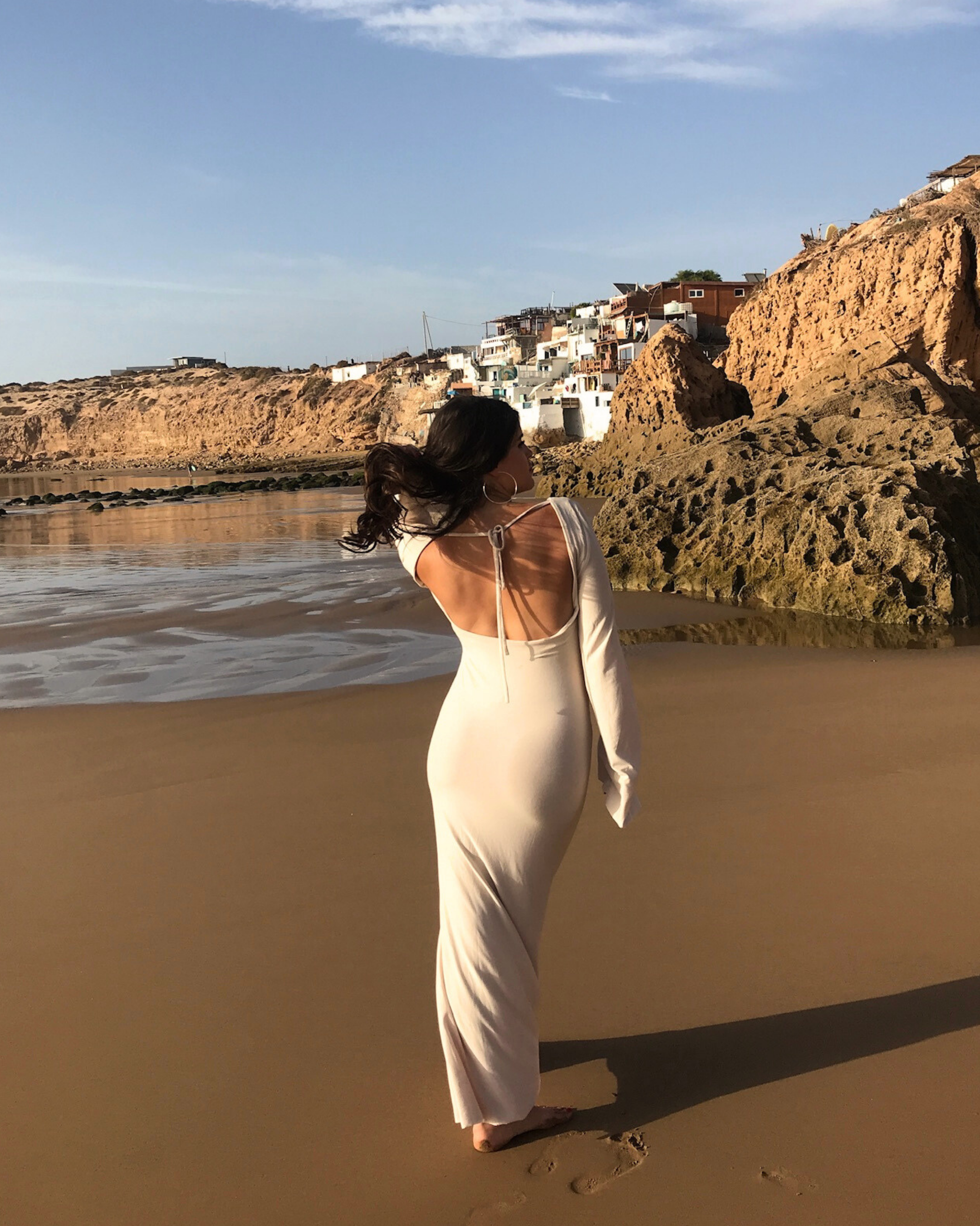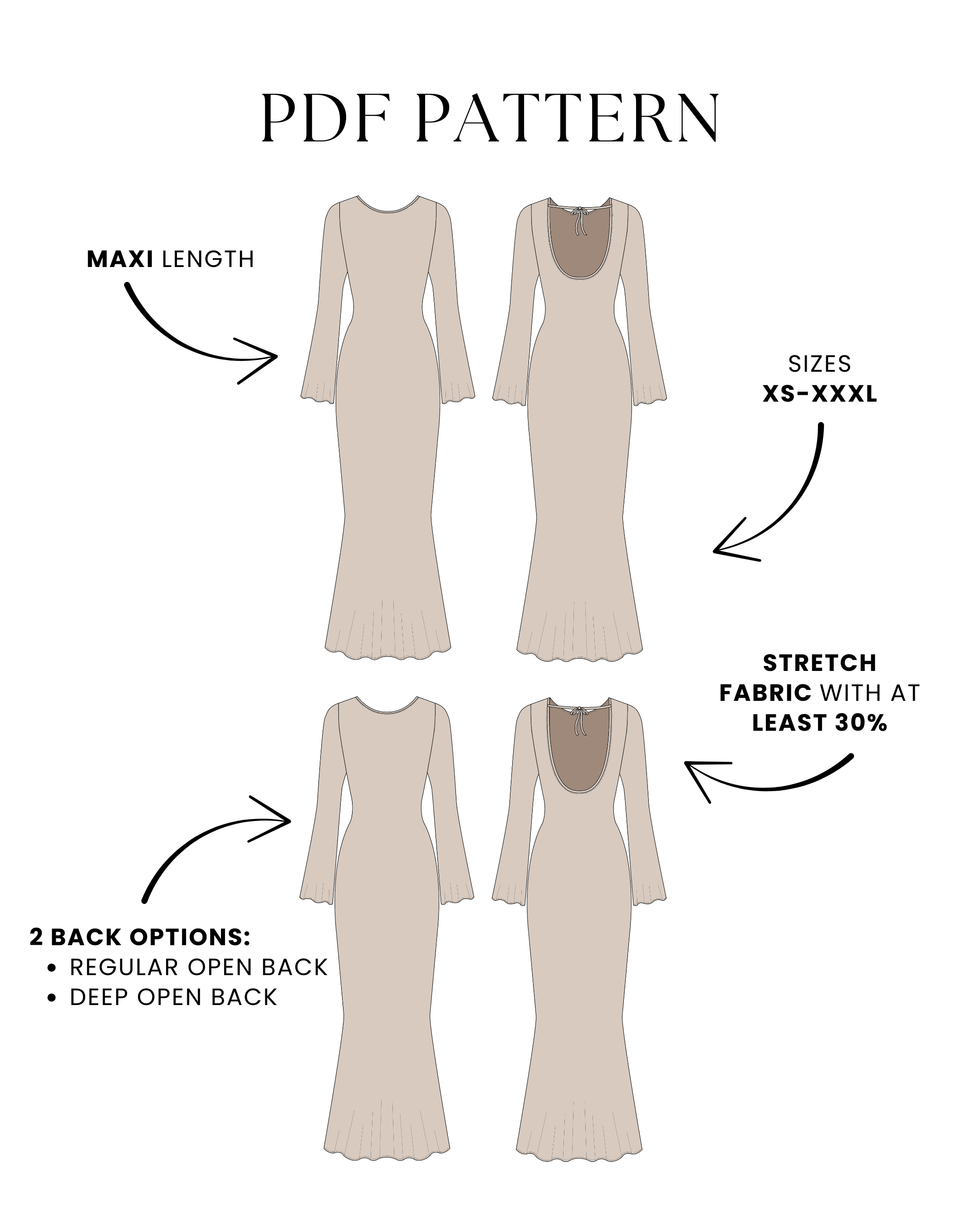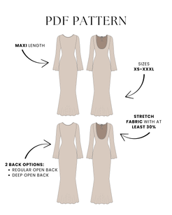 This is the digital PDF sewing pattern for the Gabriella Dress. A long and stylish maxi dress, it’s designed to gracefully reach your ankles while highlighting your curves for a confident, elegant look. The dress features long bell sleeves and a tie at the back, adding a pretty detail and allowing you to adjust the fit.