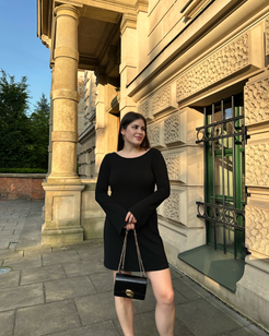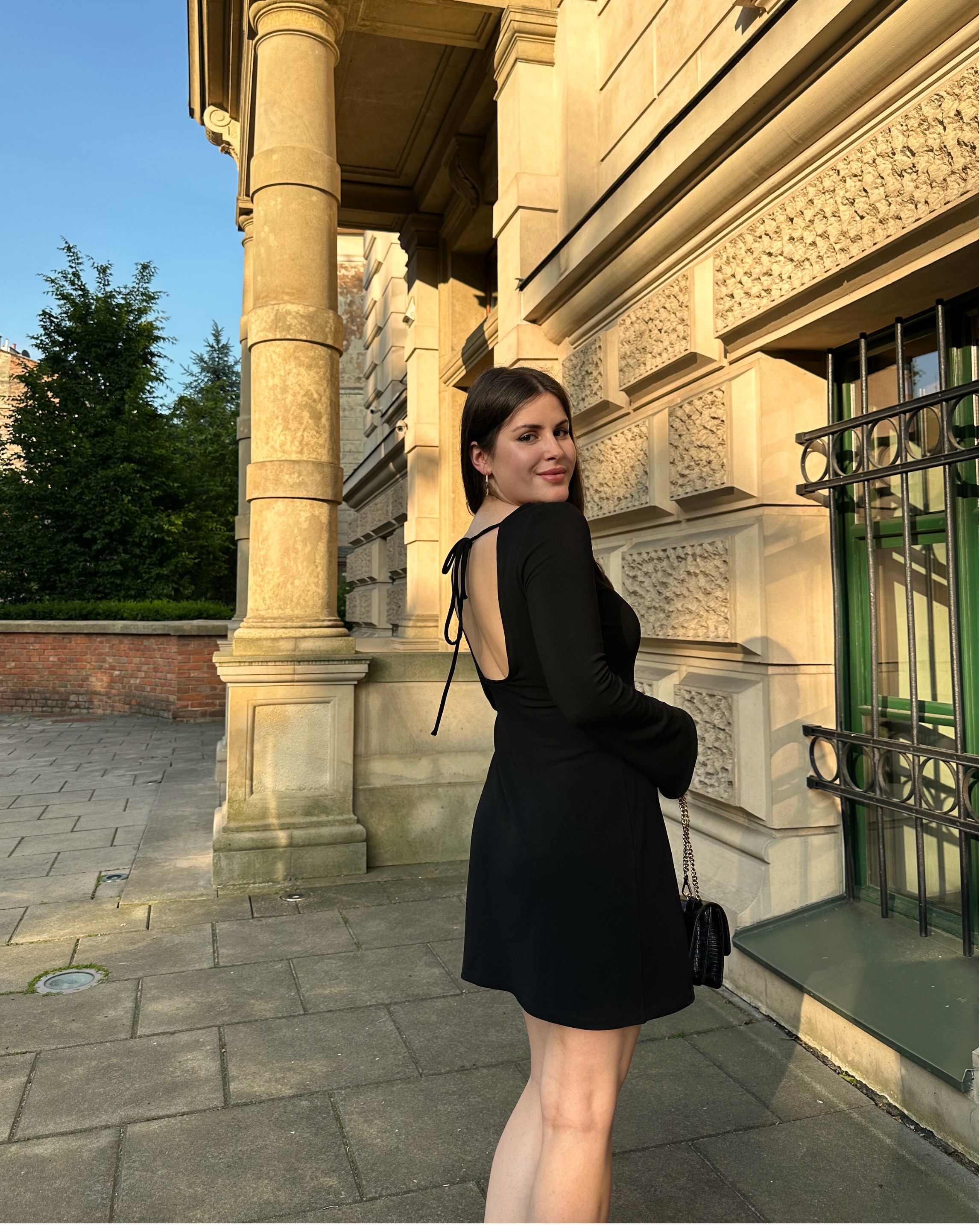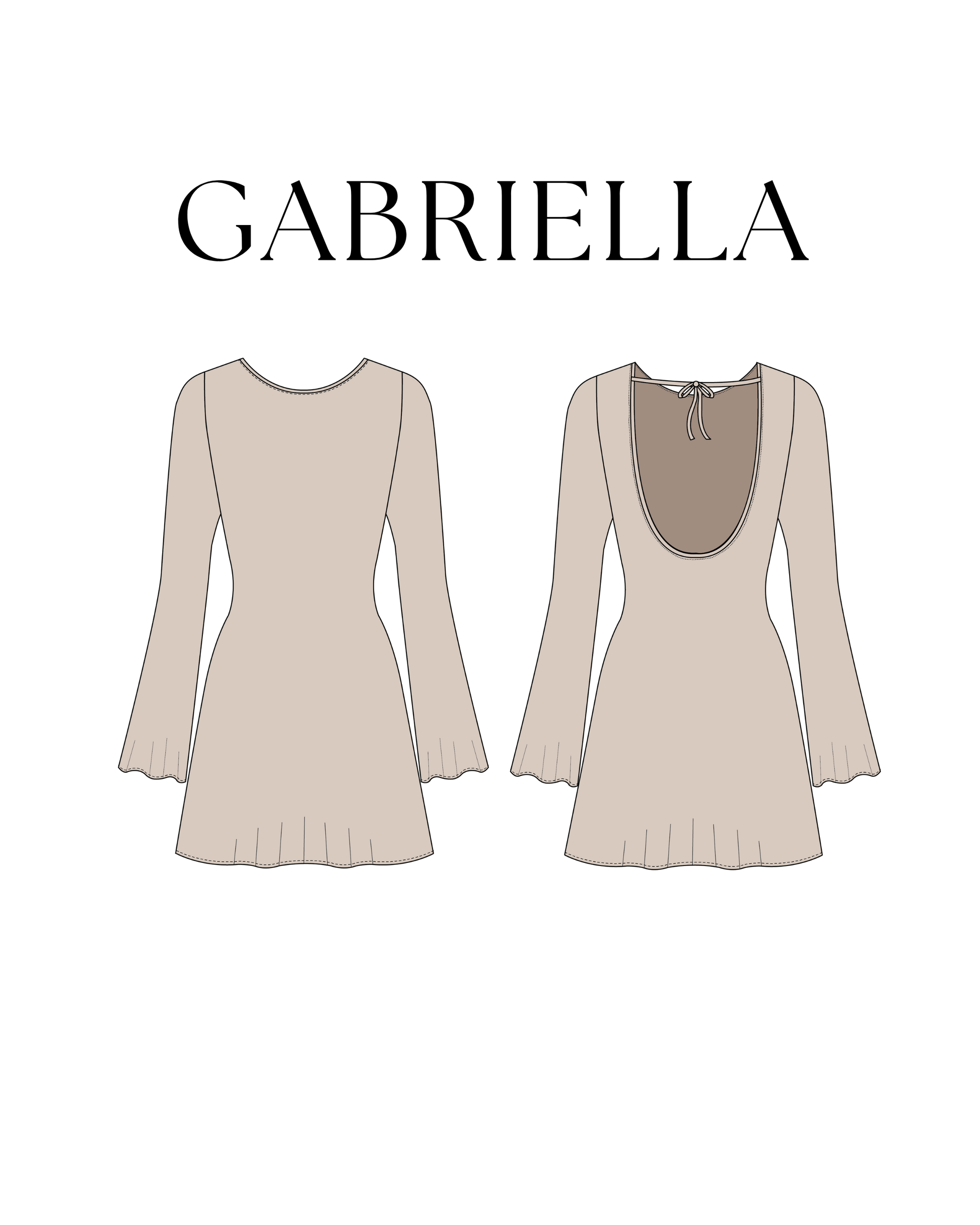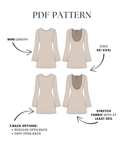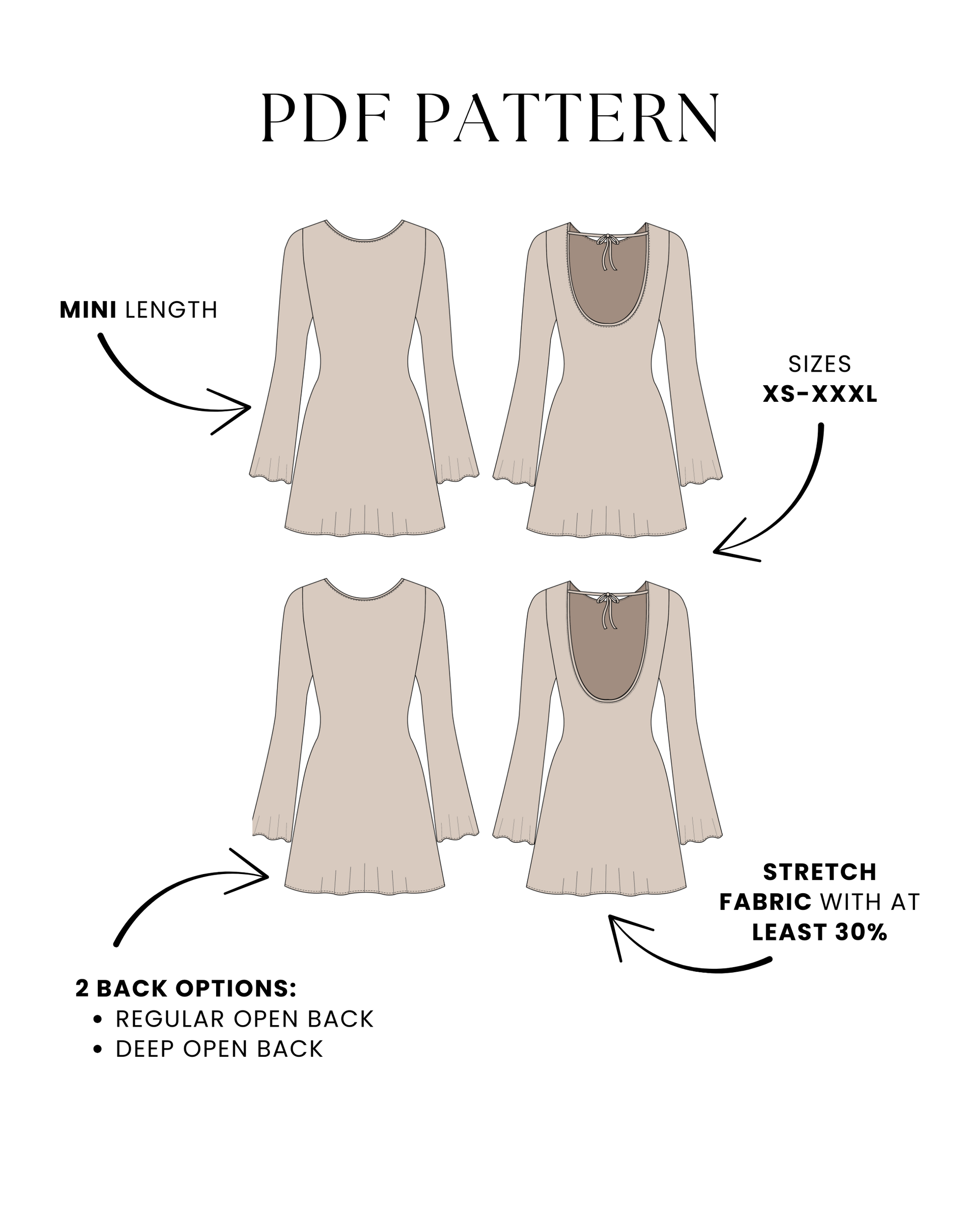 This is the digital PDF sewing pattern for the Grace Dress. It’s a classic mini A-line dress that suits all body types. The A-line shape flares gently from the waist, giving a comfortable fit while showing off your waist. The dress has long bell sleeves for a stylish touch and a tie at the back that adds detail and lets you adjust the fit.