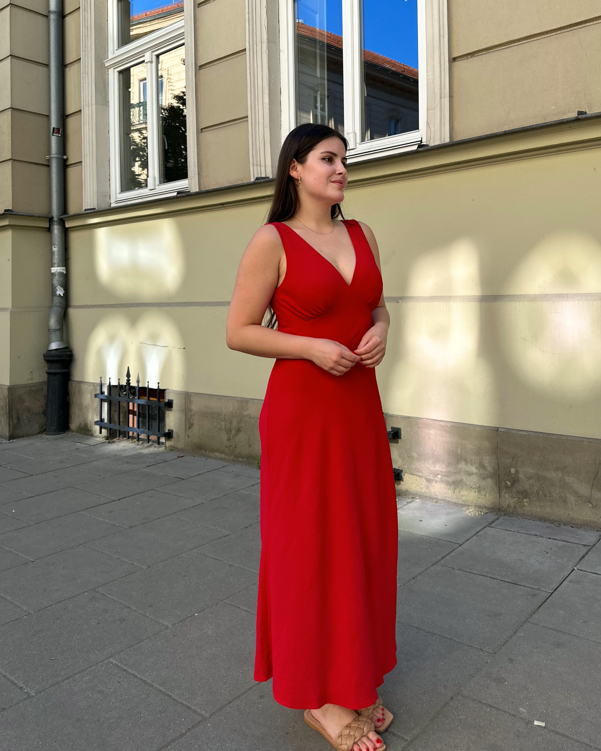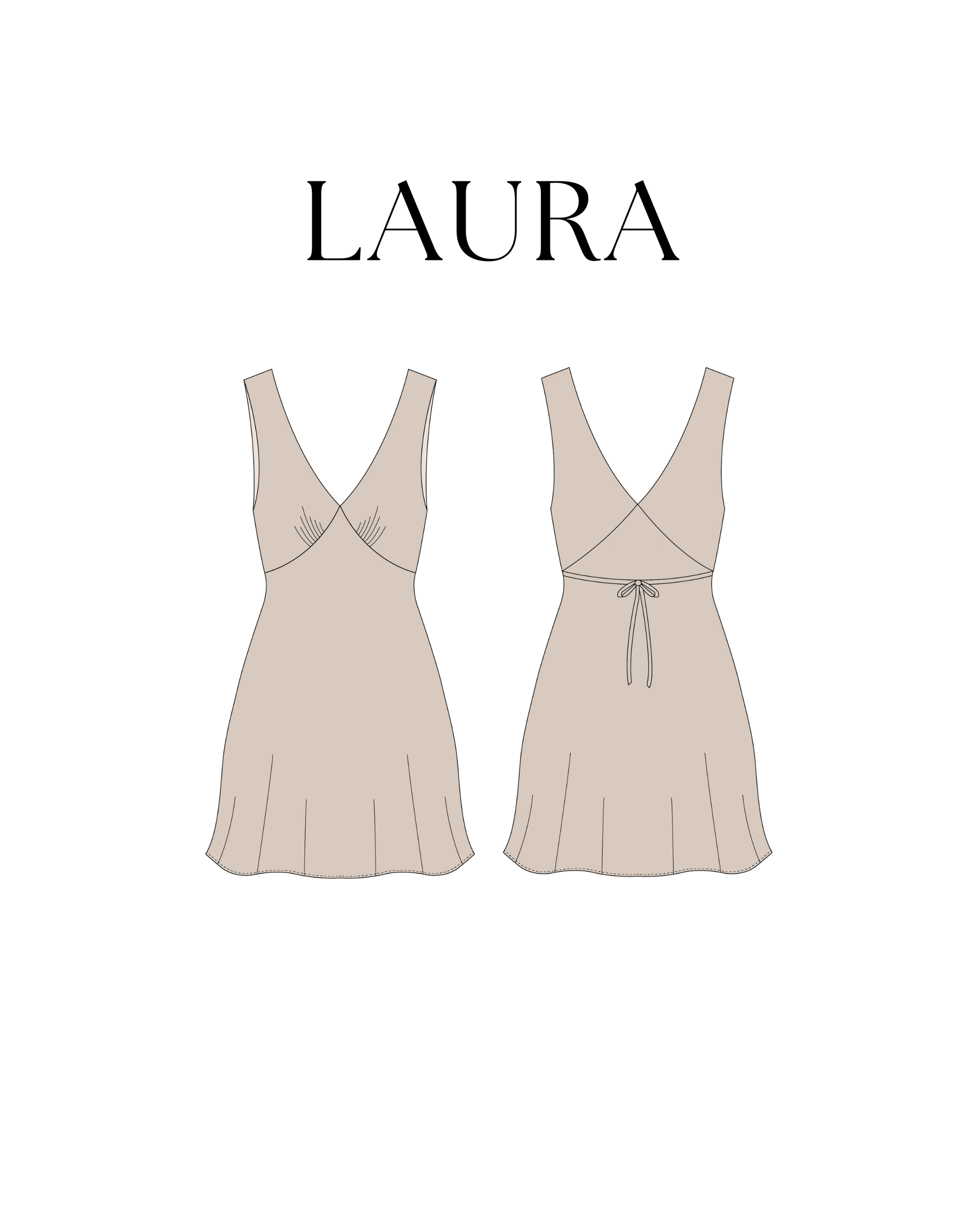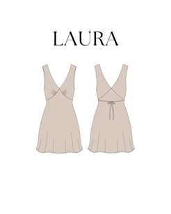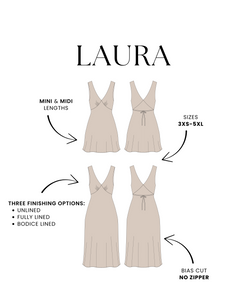 This is the digital PDF sewing pattern for the Laura Dress. Designed with a classic V-neckline and a flattering A-line silhouette, this dress is cut on the bias, giving it a naturally elegant drape and a comfortable fit without the need for a zipper. The gathering detail at the bust adds an elegant touch. The dress is designed without sleeves (for the version with sleeves, see the Lorraine Dress).