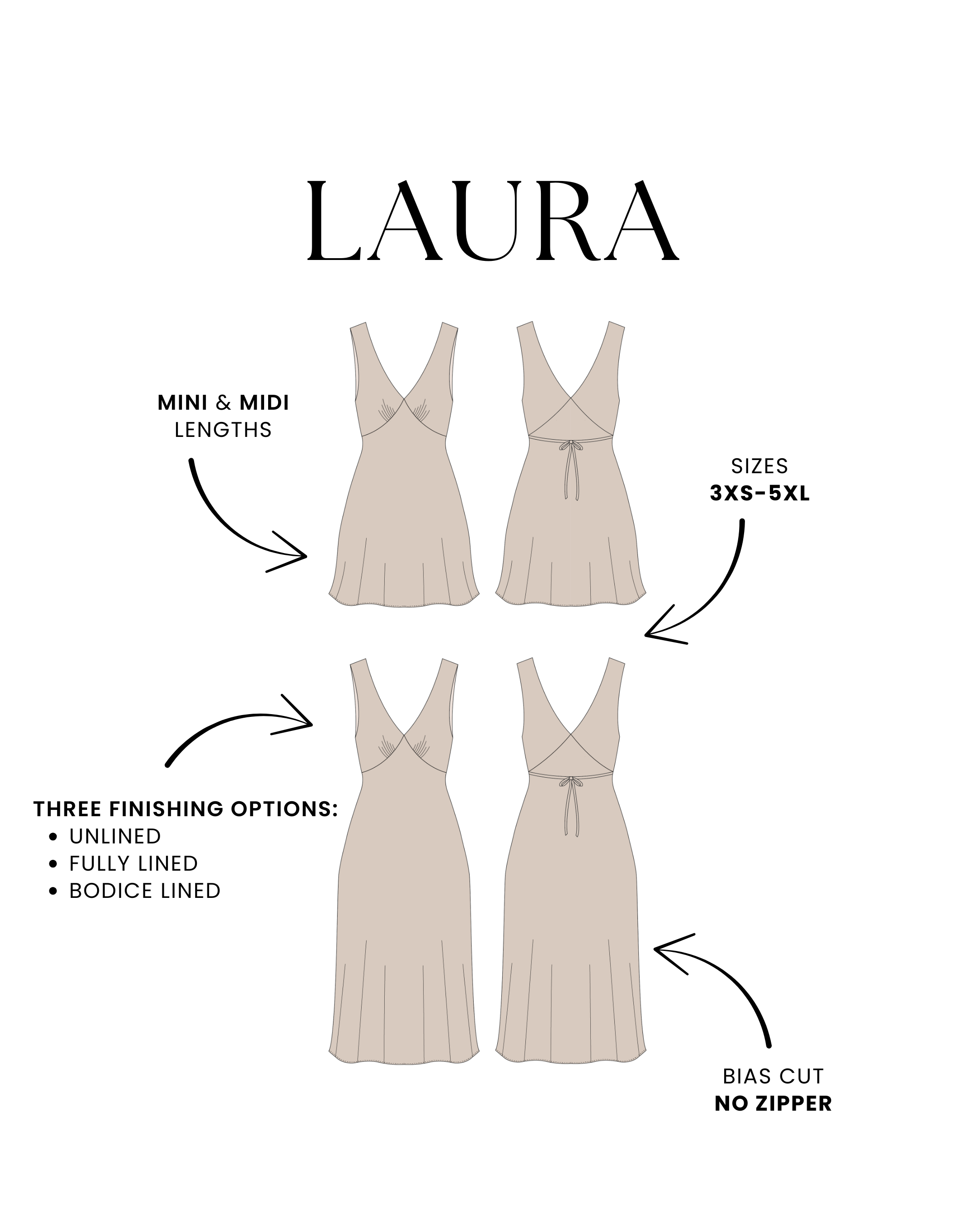 • Includes 3 finishing options: unlined, fully lined, or bodice lined.