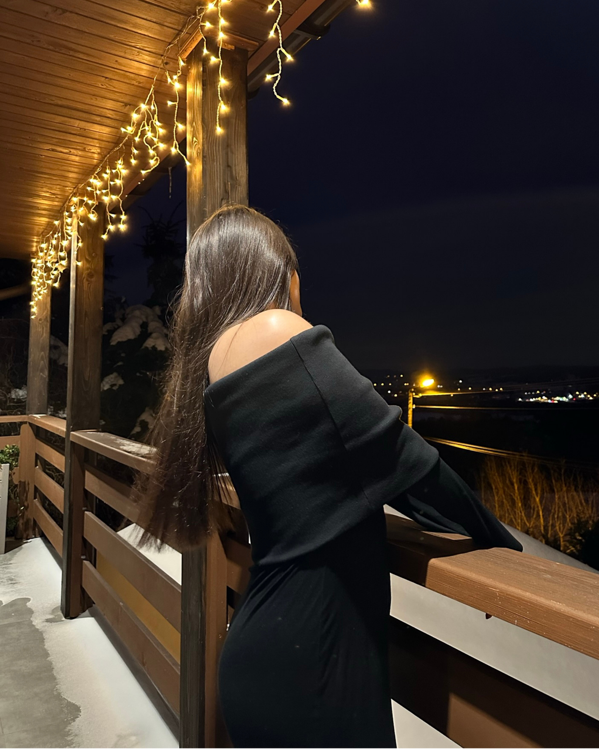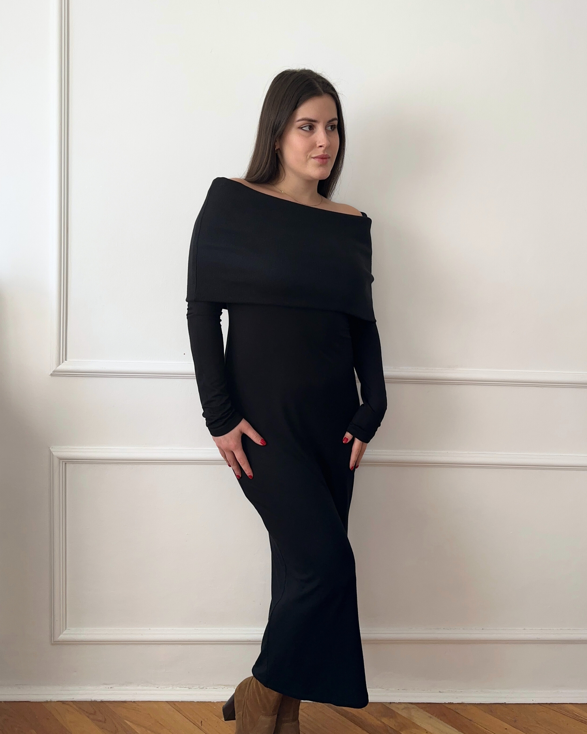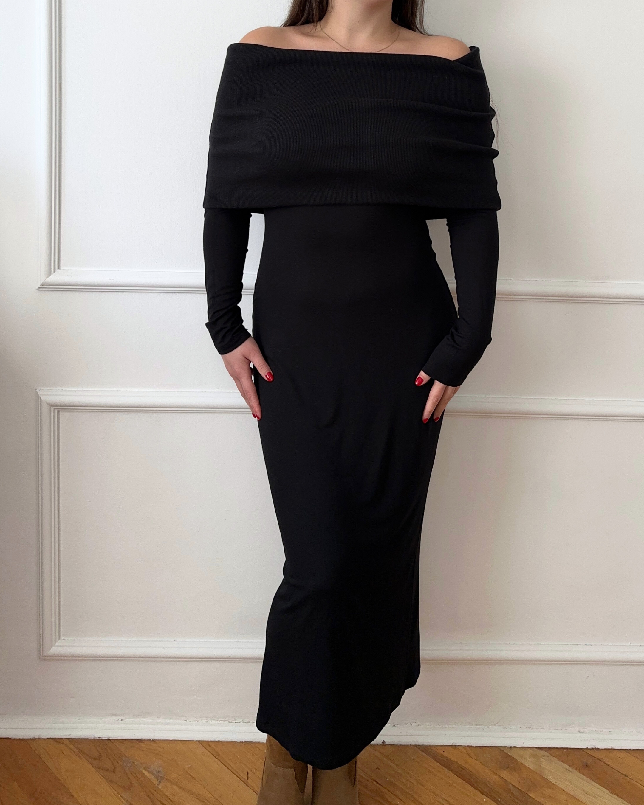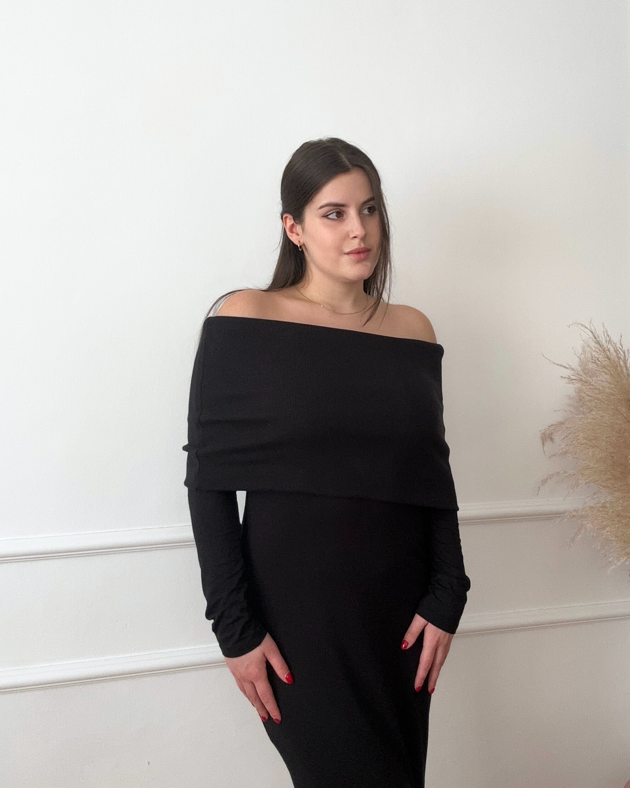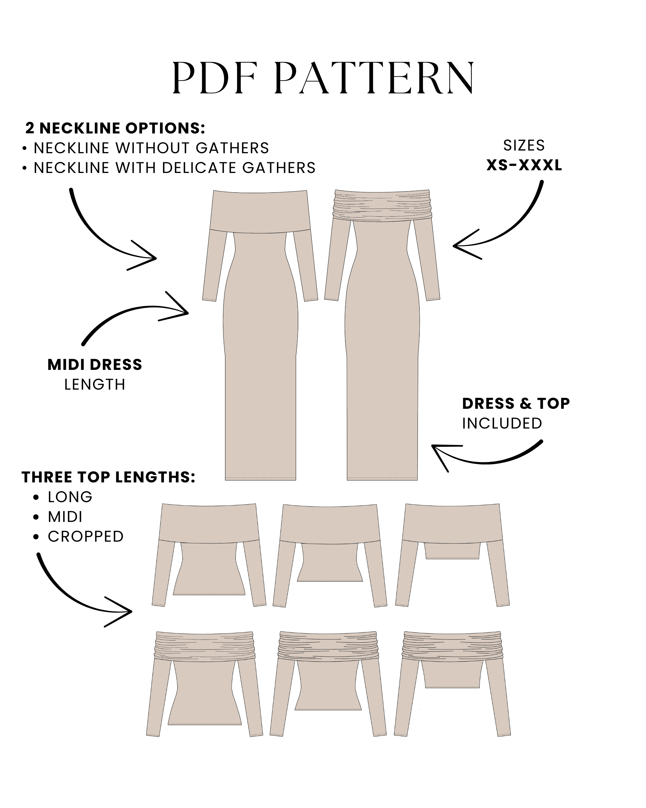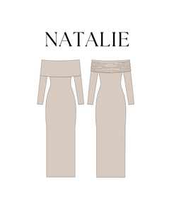 This is the digital PDF sewing pattern for the Natalie Dress. An off-shoulder design with long sleeves, it’s made for stretch fabrics and features a fitted silhouette that highlights the shoulders, body, and hips for a feminine and elegant look. The dress is available in a midi length.