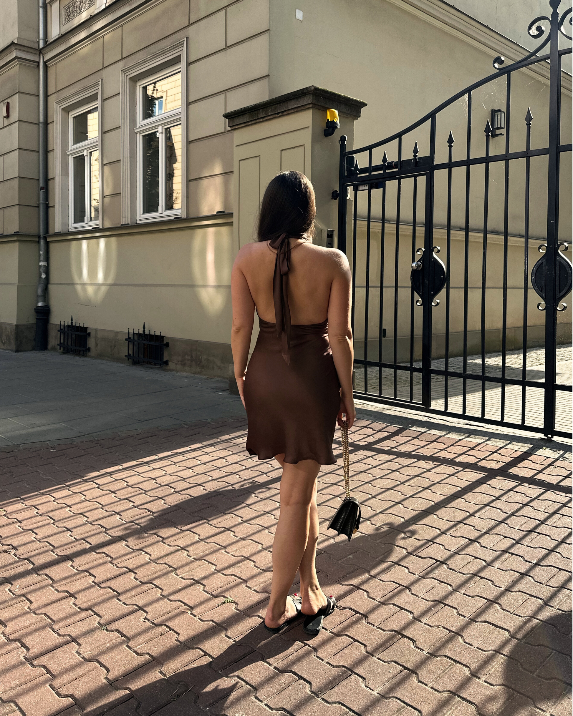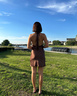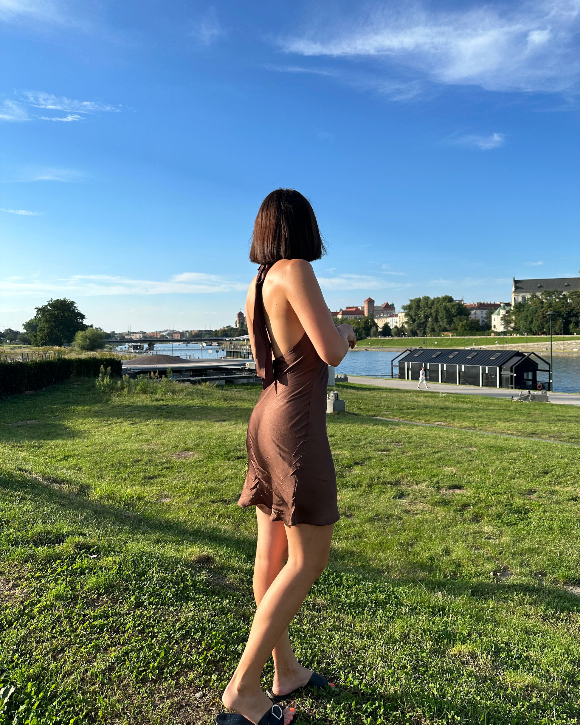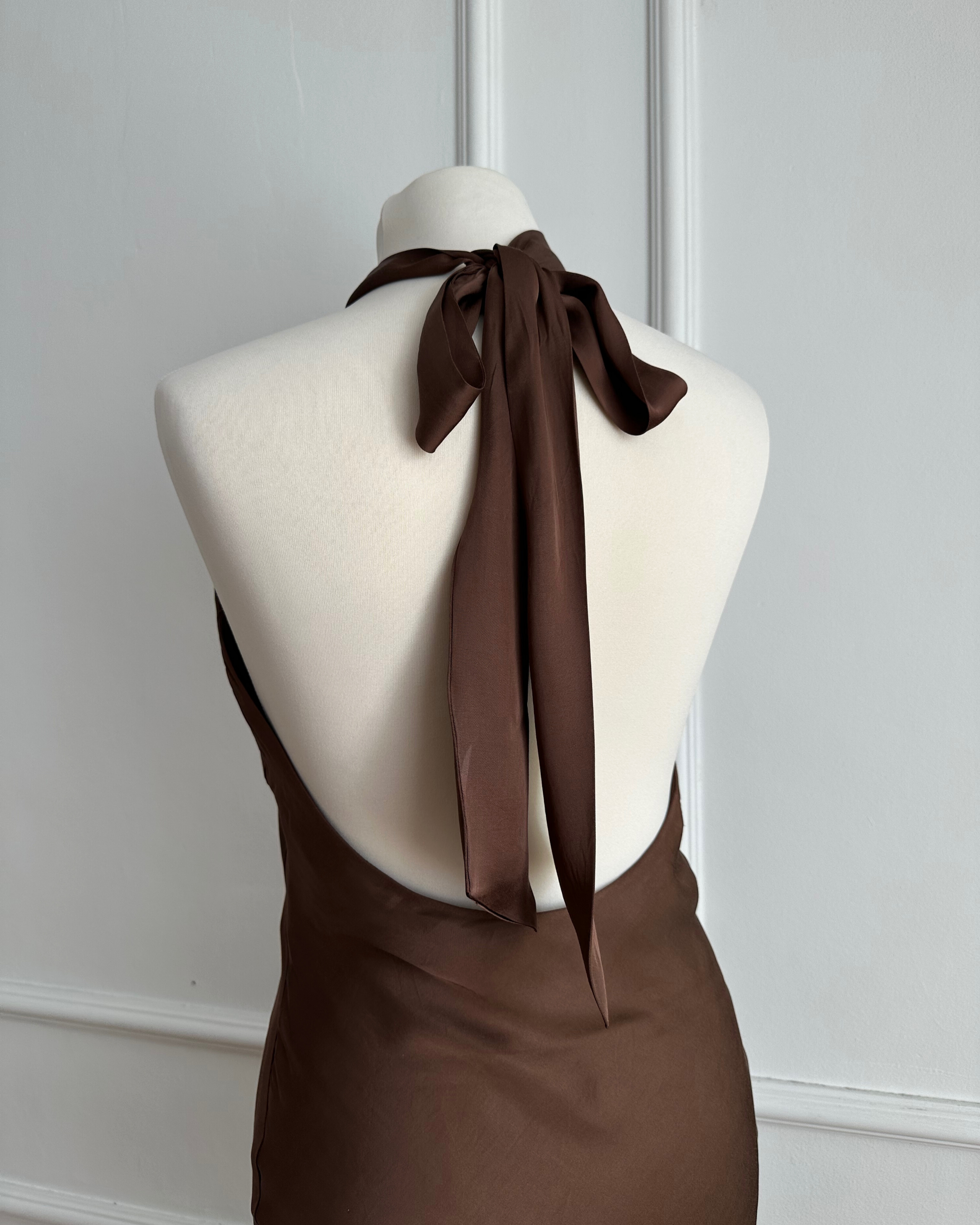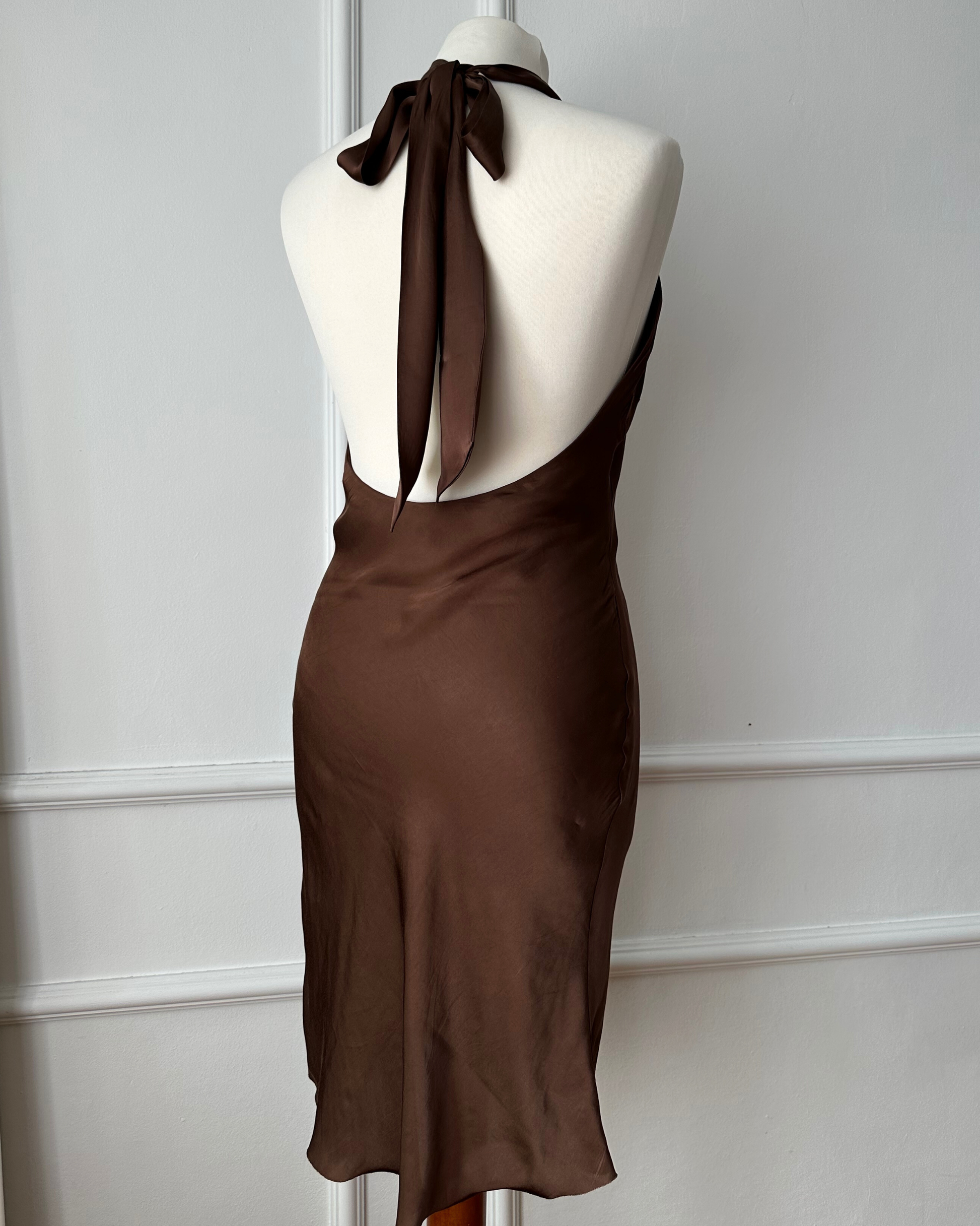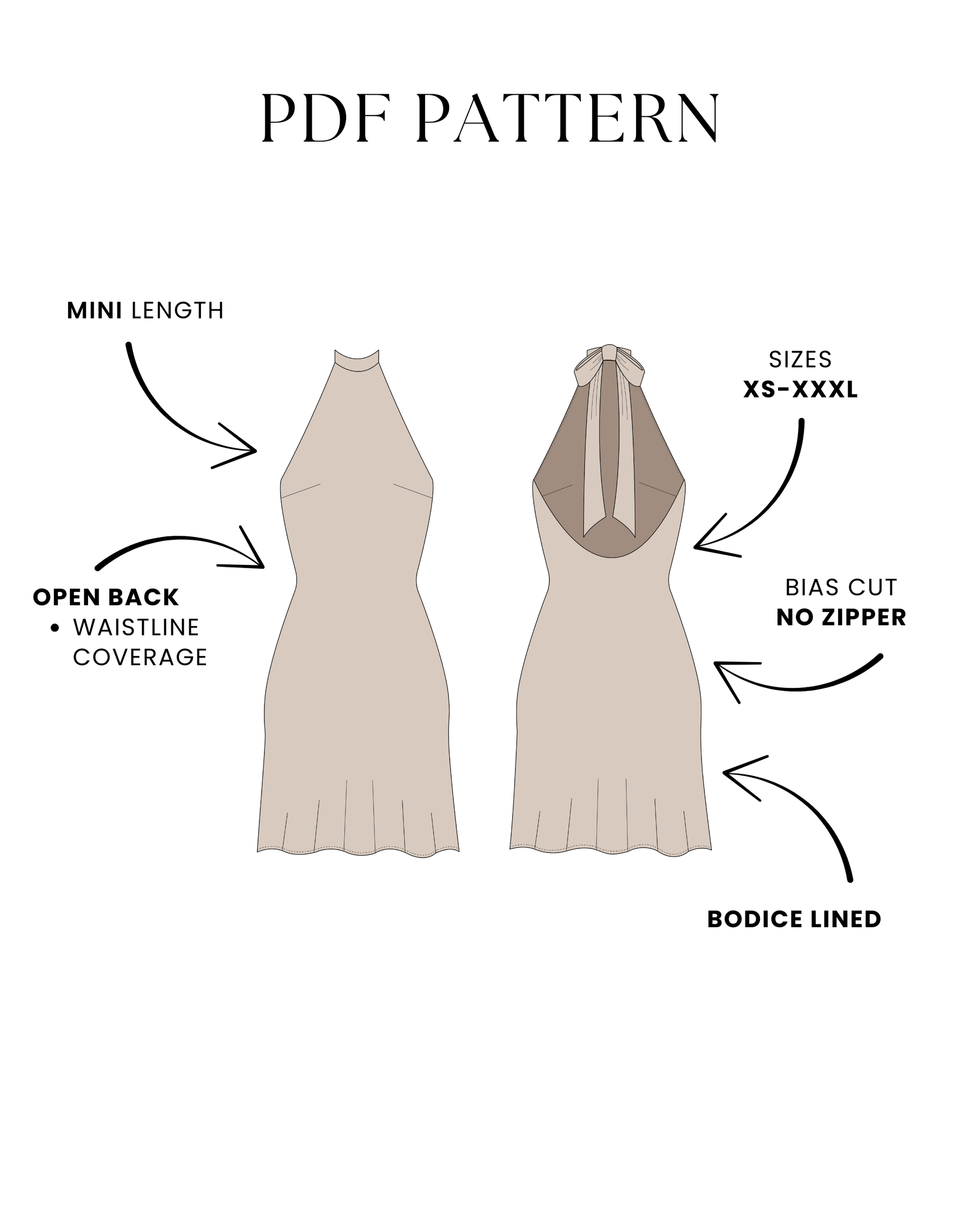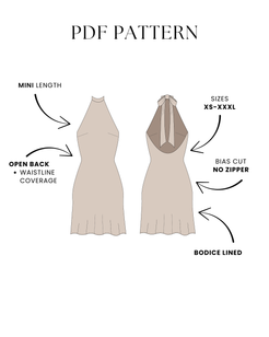 This is the digital PDF sewing pattern for the Tiara Dress. The dress features a tie at the neck, an open back, and lined bodice. The pattern is designed to be cut on the bias, which allows the fabric to drape closely to the body for a flattering fit. The dress is designed as a slip-on style, eliminating the need for a zipper.